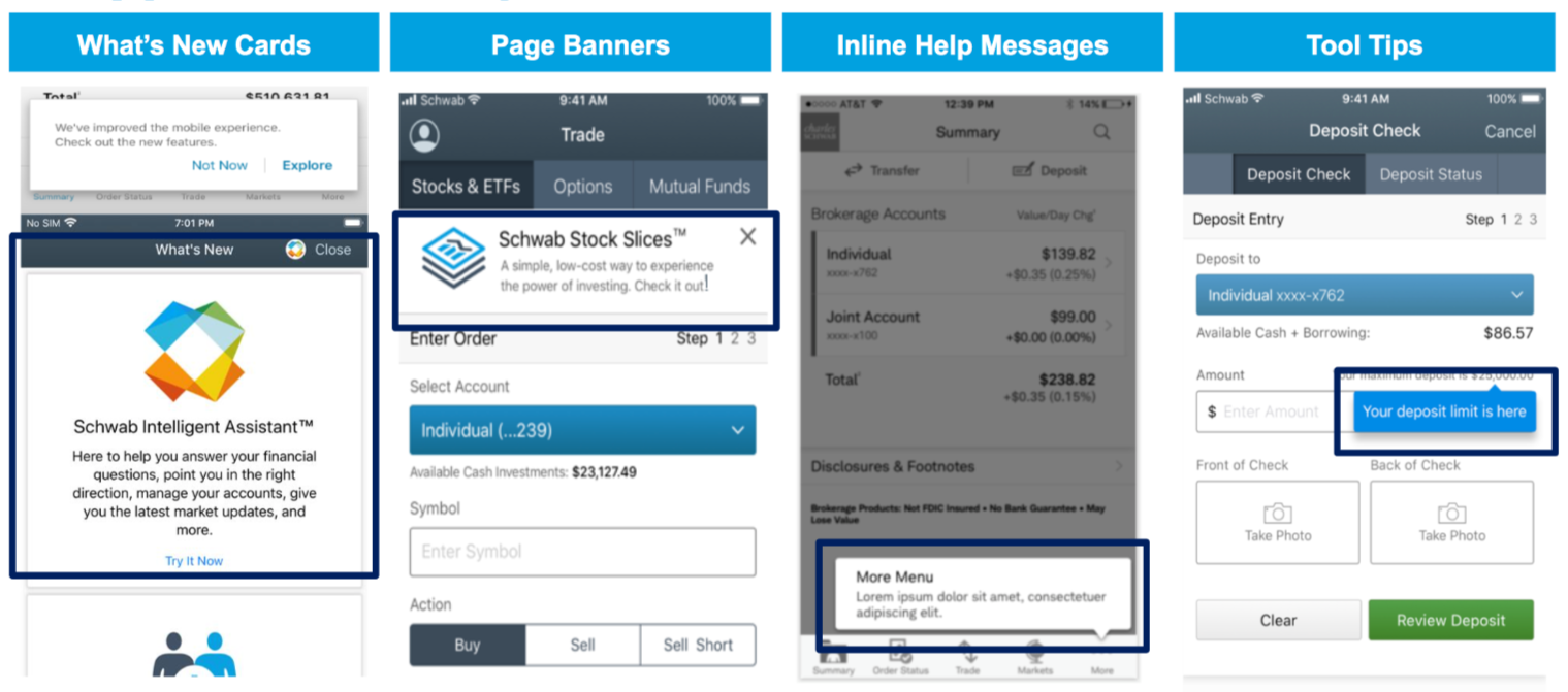 - “What’s new” card views should be utilized every time Schwab releases something new while the user is opening a screen. This card view can display views on top of each other, helping to give a rich feel and look to the UI design.