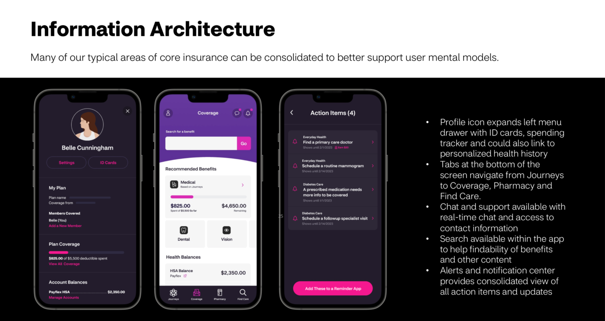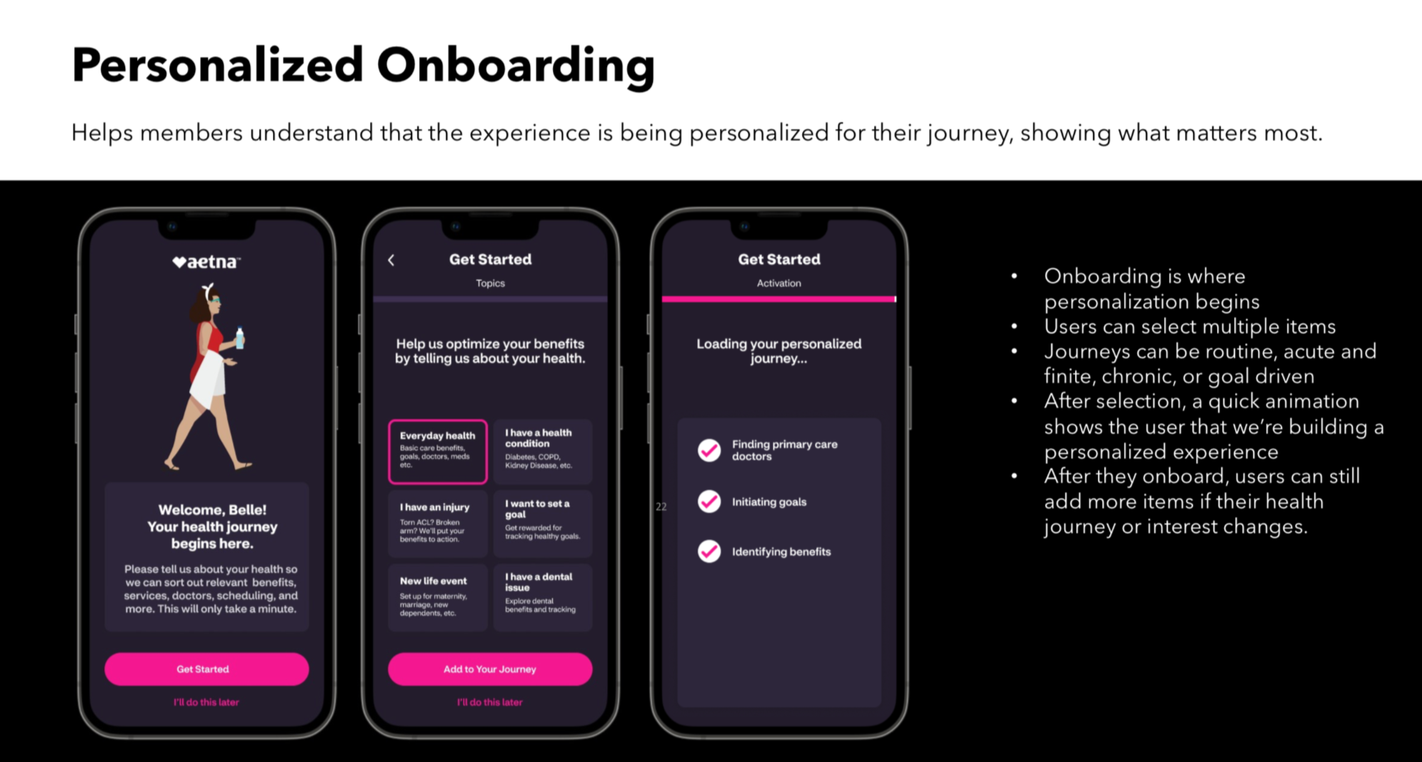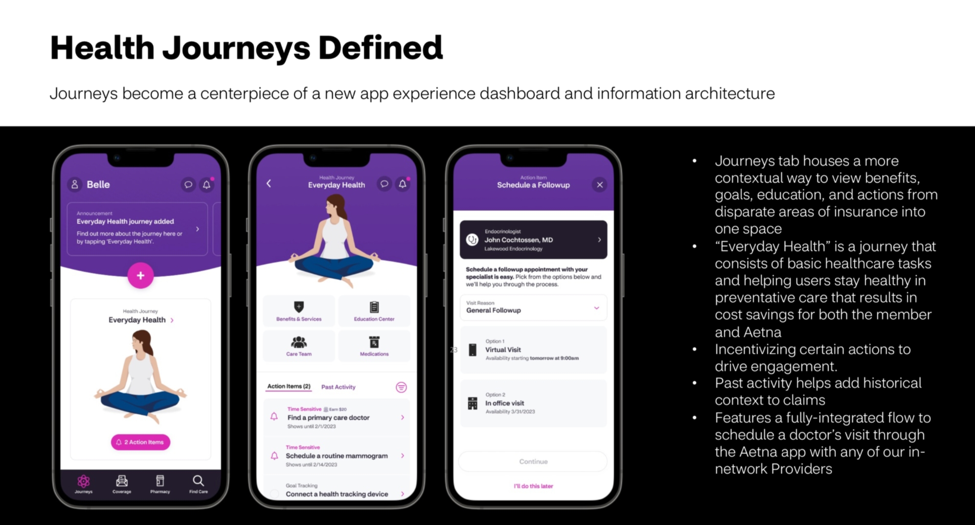 The North Star is a user-centered experience framework for Aetna Health - focused on modular “journeys” that guide the member in their moments of care. Utilizing our core business strategy and key insights, we can redefine how people use their benefits and become their health insurance guide- their health champion.