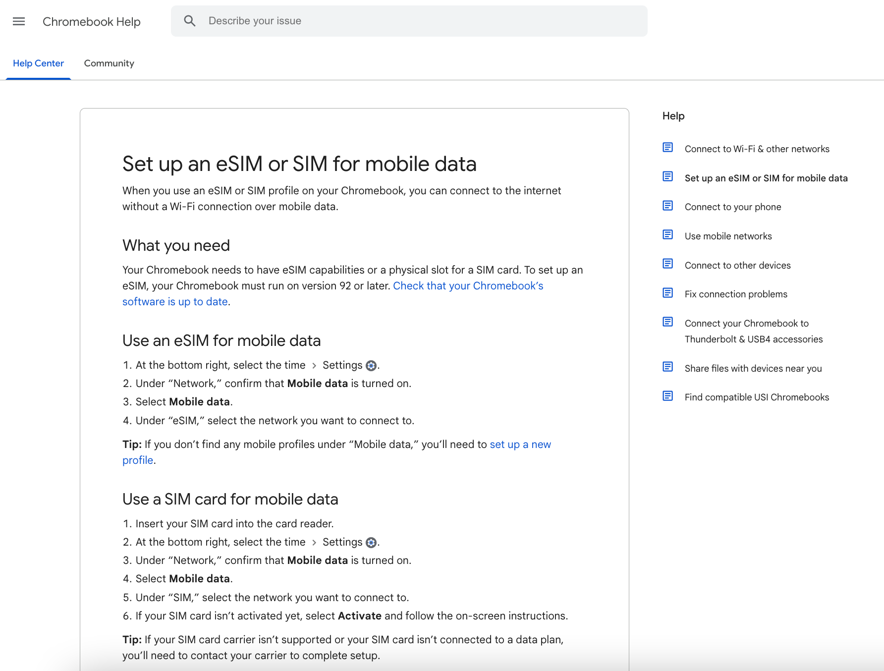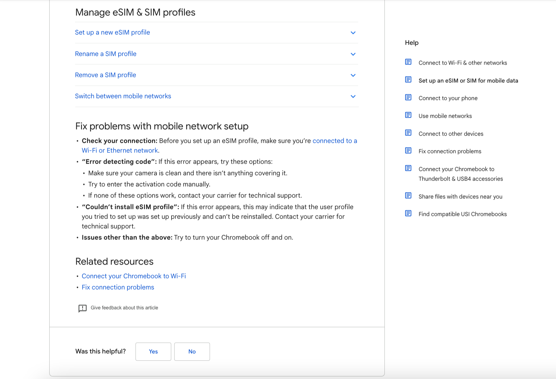 In this use case I was tasked with creating step-by-step guidance to help users upload an eSim profile to their Chromebook. With the end goal of fast-tracking education-sector users.