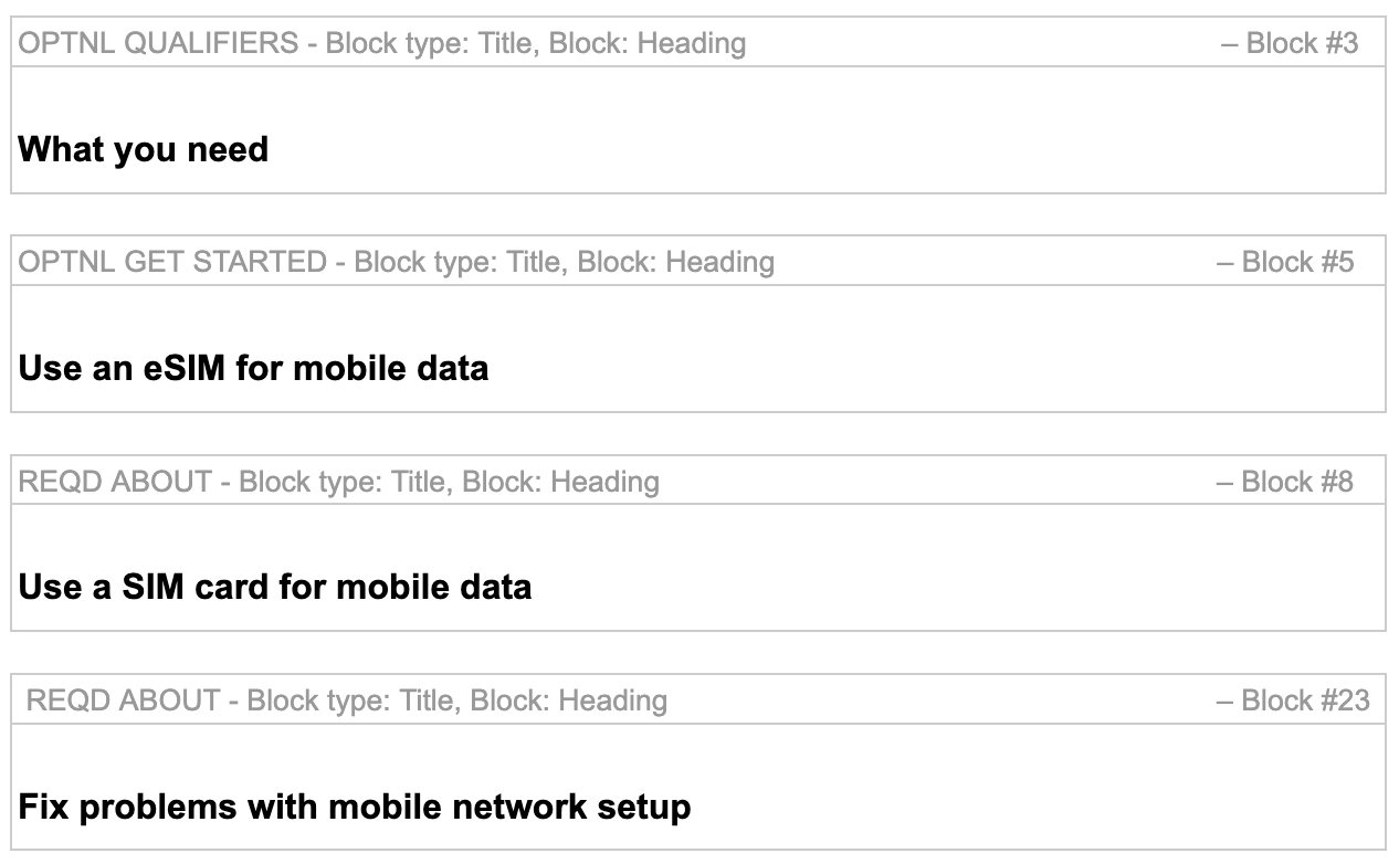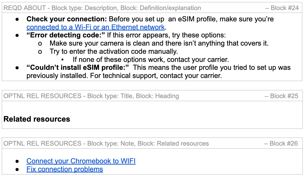 A self-help journey is the path user’s take to finish a specific task – in this case upload eSim/Sim profile to Chromebook. Therefore, I have made sure I identified and included each step in the user self-help journey, from the starting point to the endpoint for the user to accomplish the task. Steps in that journey that include the tools they will need, all use cases and potential unhappy paths.