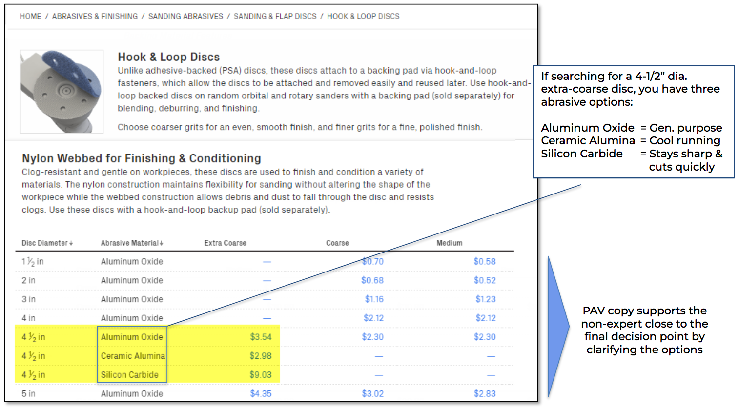 PAV copy explains the benefit of specific attribute values on the page. Whenever we ask a customer to decide between values in tables and/or filters, we need PAV copy if the benefits wouldn’t be immediately obvious to the non-expert.