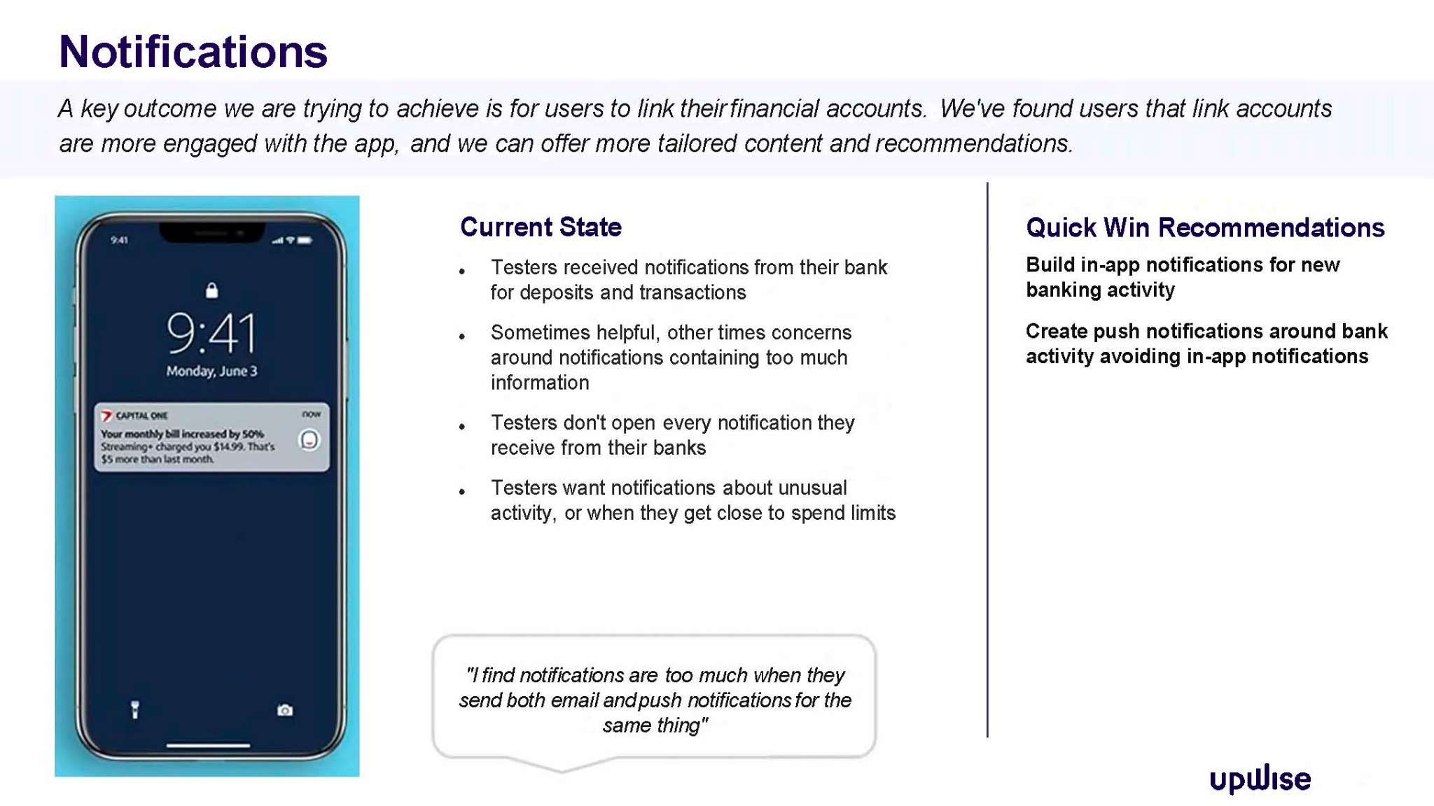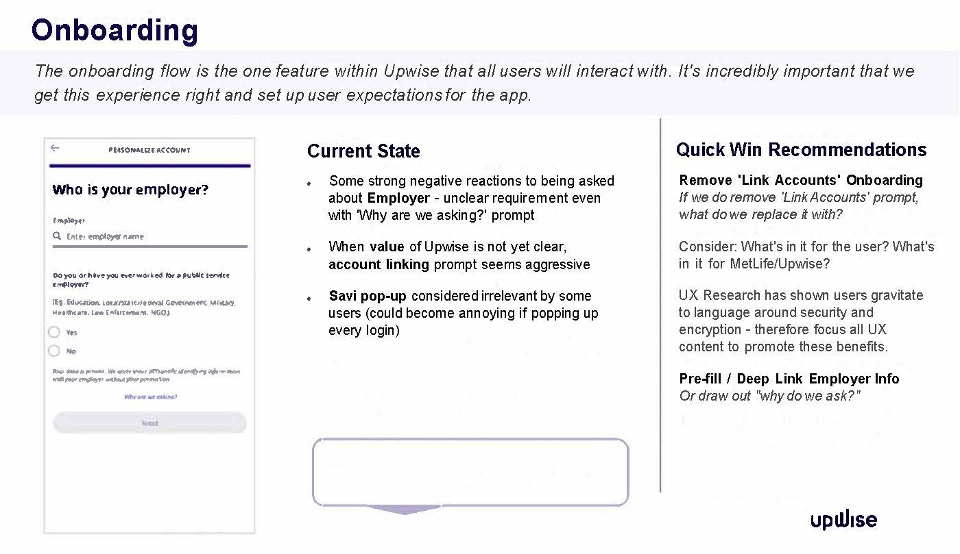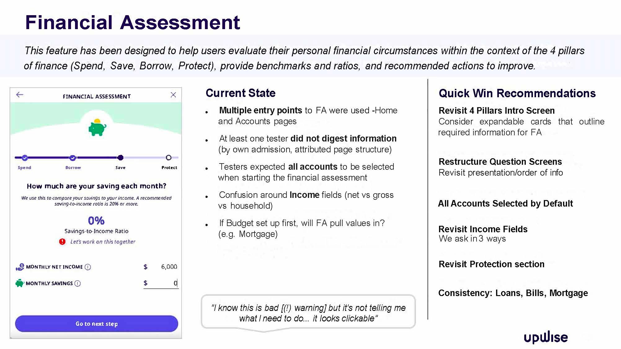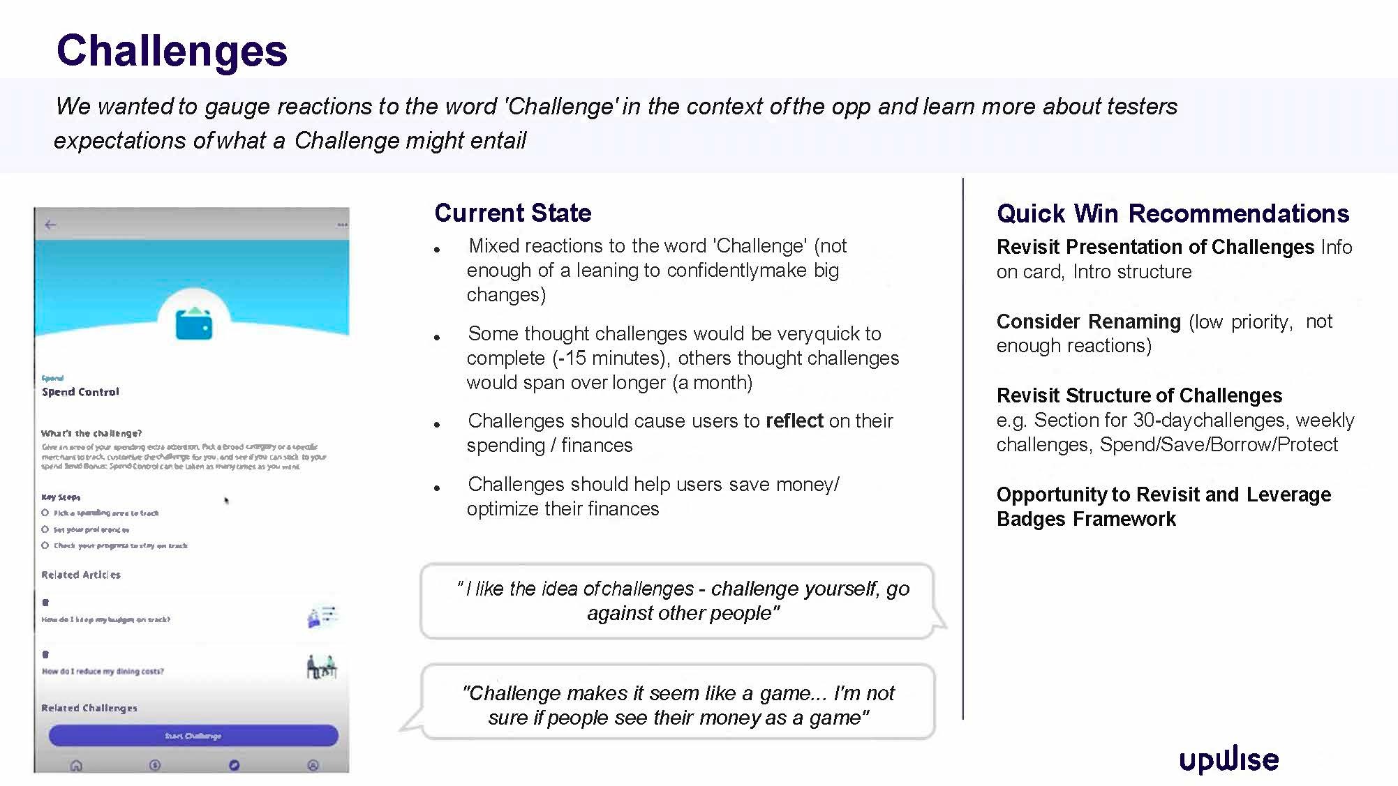 Upwise user engagement is lower than desired. I was tasked with identifying from a content design lens what were the key drivers for this. To determine what value users, expect from this financial app in terms of content design and in turn to identify some quick wins. The end goal being to offer intuitive tools and features that help users make progress on their financial goals.