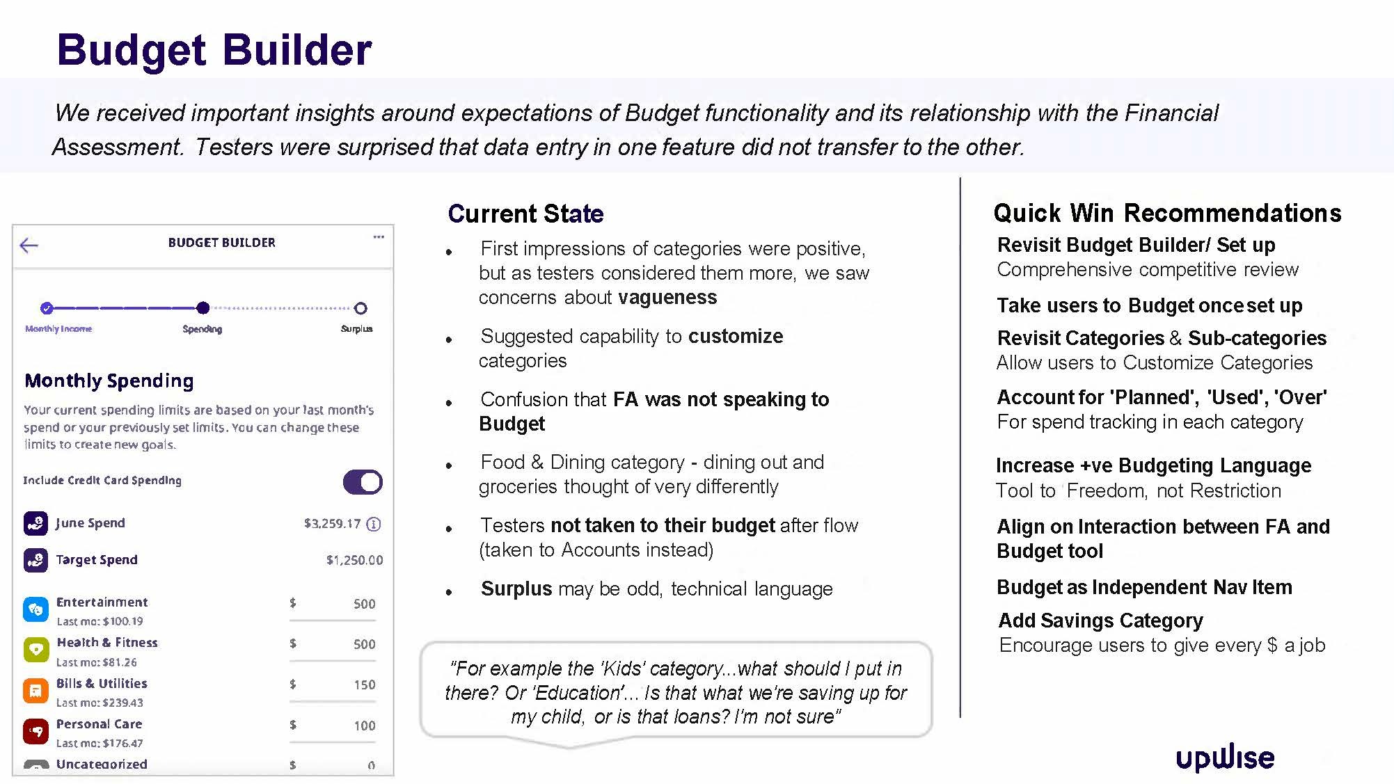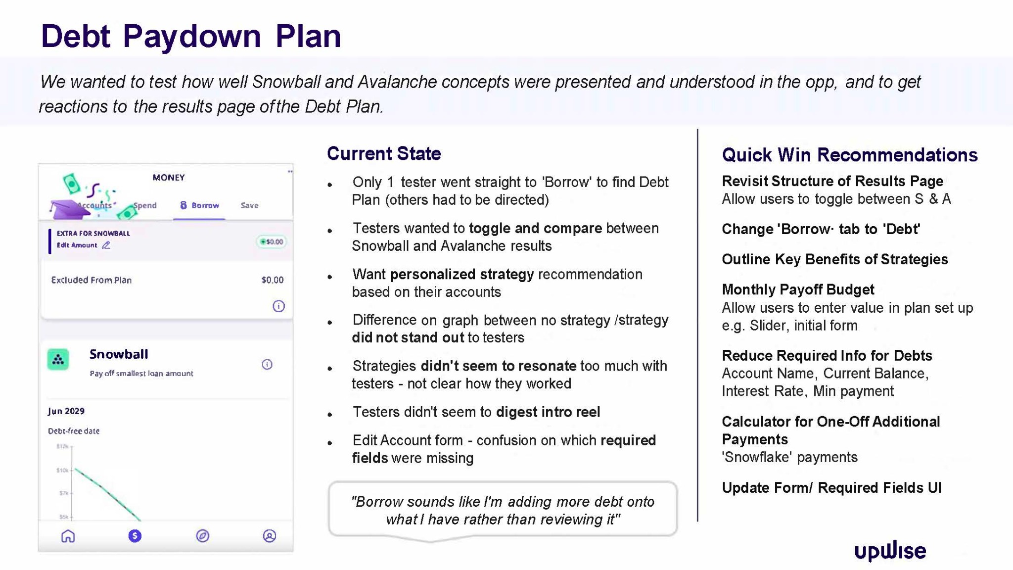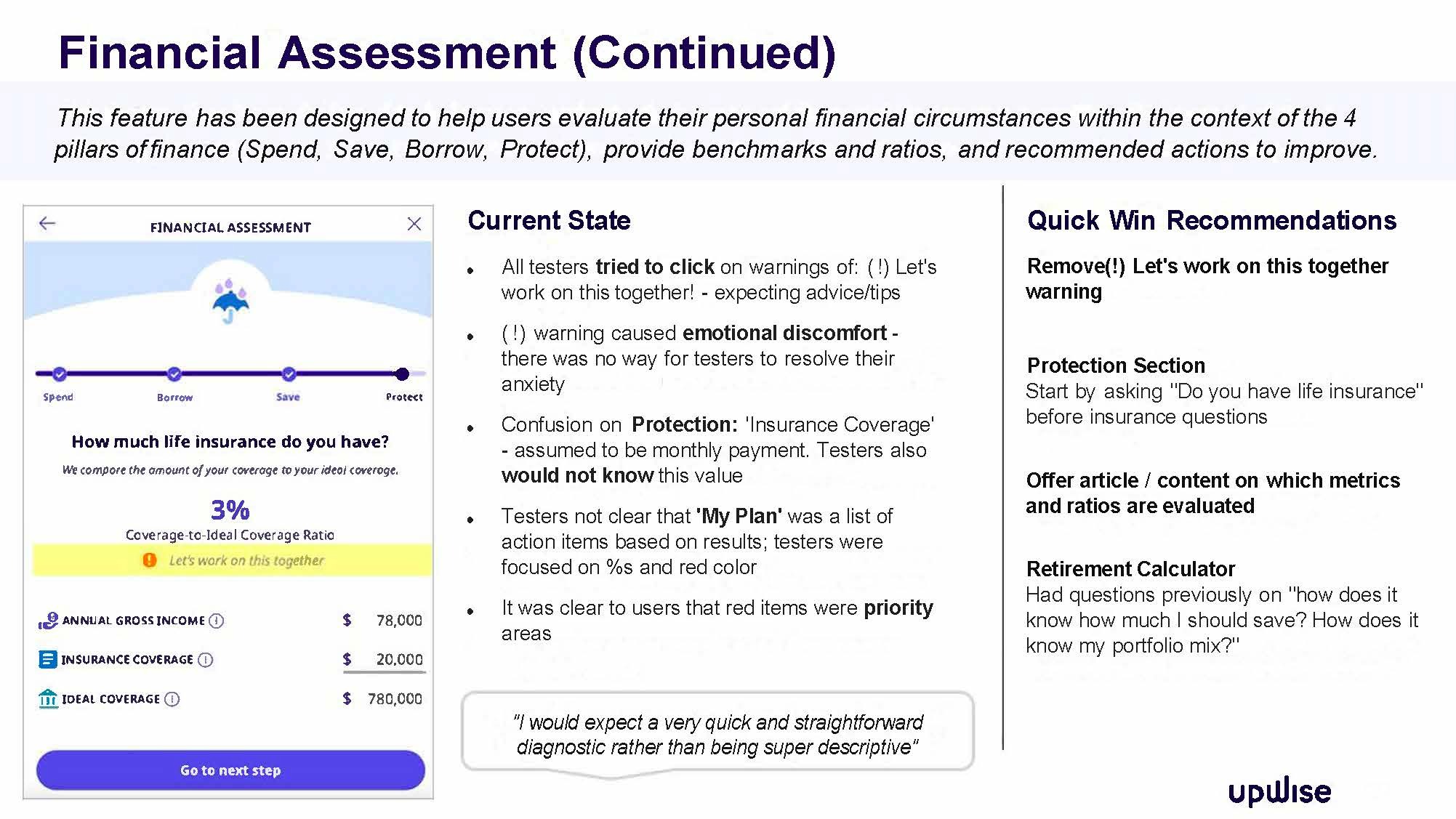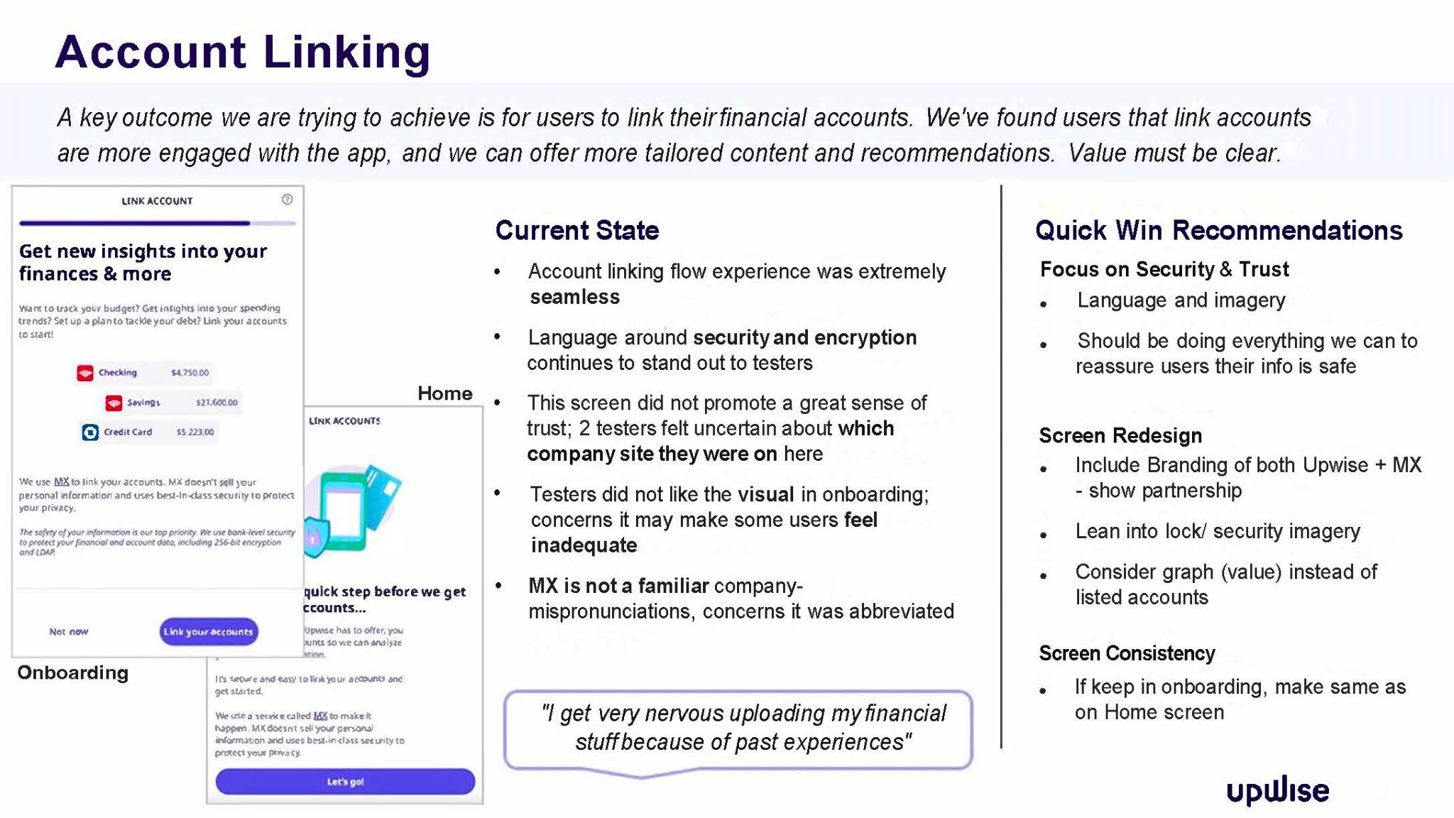 Upwise user engagement is lower than desired. I was tasked with identifying from a content design lens what were the key drivers for this. To determine what value users, expect from this financial app in terms of content design and in turn to identify some quick wins. The end goal being to offer intuitive tools and features that help users make progress on their financial goals.