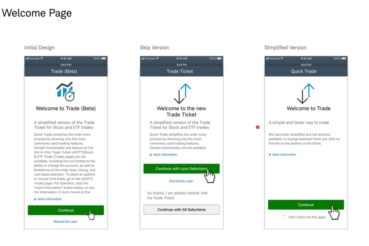 Microcopy in these Schwab Trading app screens makes it clear what the user is supposed to do. To get to this stage, I have made sure I identified and included actionable language in each step of the user journey, from the starting point to the endpoint. Steps in that journey that include the tools they will need, all use cases and potential unhappy paths.