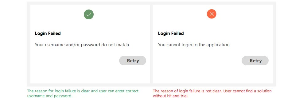 - Provide descriptions of the exact problems to help users understand what happened.