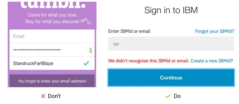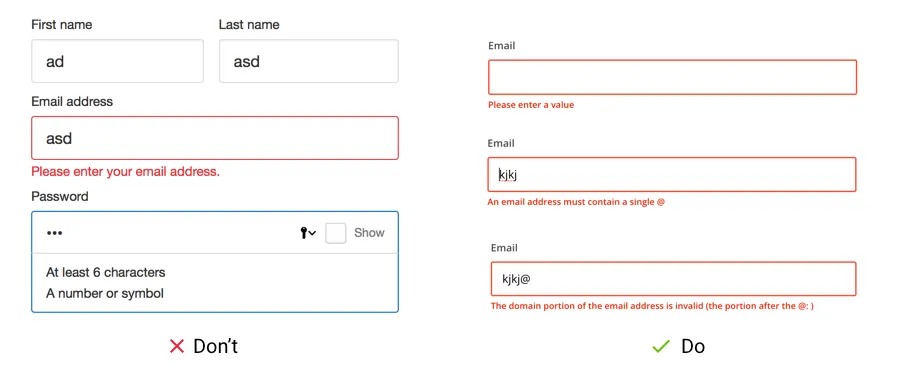 Very often websites use only one error message for all validation states. For example, you left this email field blank — “Enter a valid email address”, versus specifically you missed the “@” character — “Enter a valid email address”.